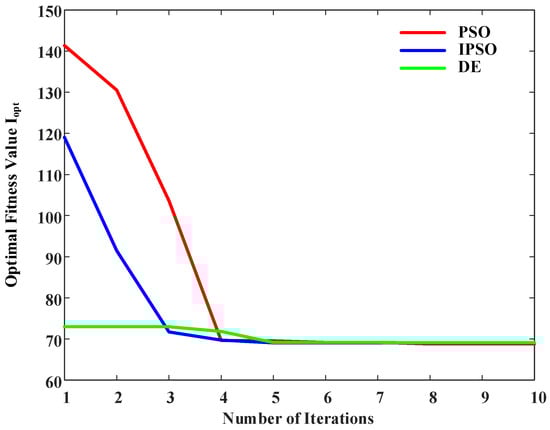 where fITAE represents the integral of frequency deviation, Os is the maximum frequency overshoot, ST denotes the frequency settling time, PITAE is the integral of active power deviation, and represents the weighting coefficients assigned to each performance metric. Under identical initial conditions and using the same objective function, the convergence performance of standard PSO, improved PSO, and DE algorithms is evaluated for parameter tuning. The evolution curves of the optimal fitness value Iopt are illustrated in Figure 4.