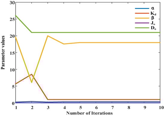As shown in Figure 5, the improved PSO algorithm was applied for parameter optimization with a particle population of 30. After 10 iterations, the optimal parameters were obtained as follows: α = 0.001, Kd = 1, β = 17.988, Jo = 0.330, and Do = 21.002. The corresponding optimal objective function value was Iopt = 69.0386.