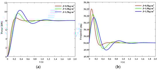 As shown in Equation (6), the virtual inertia J and damping coefficient D have a significant impact on the dynamic response characteristics of the VSG second-order system. Based on the simulation parameters listed in Table 1, the dynamic responses of active output power and frequency under varying values of inertia and damping are obtained by substituting them into Equation (5), as illustrated in Figure 6.