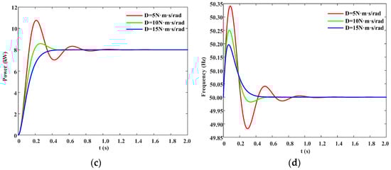 Impact of different parameters on system output responses. (a) Active power response curves of the VSG under different virtual inertia values (D = 10 N·m·s/rad). (b) Frequency response curves of the VSG under different virtual inertia values (D = 10 N·m·s/rad). (c) Active power response curves of the VSG under different damping coefficients (J = 0.5 kg·m2). (d) Frequency response curves of the VSG under different damping coefficients (J = 0.5 kg·m2).