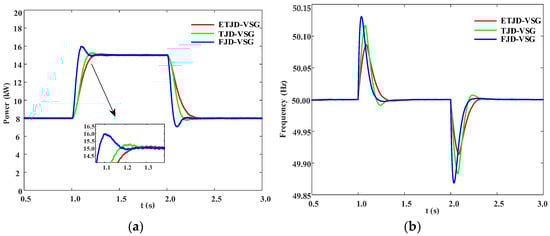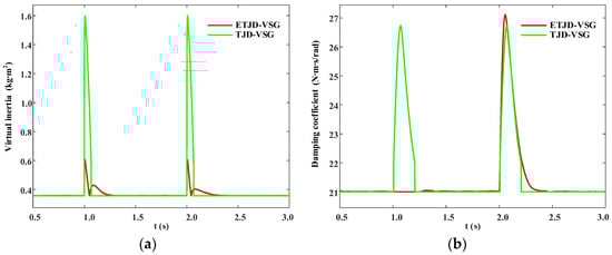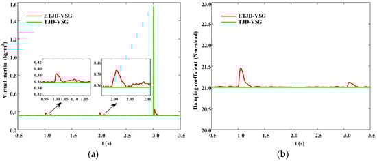 As illustrated in Figure 10a,b, the segmented threshold-based TJD-VSG displays a significant limitation in adapting to small disturbances. Because both the virtual inertia and damping are activated only when hard thresholds are crossed, the virtual inertia J remains fixed at its nominal value J0 during minor load changes at 1 s and 2 s, and only exhibits a sudden jump to 1.6 kg·m2 during the load reduction at 3 s, followed by a rapid drop. Meanwhile, the damping coefficient D remains constant at D0 throughout the simulation, providing no additional support to suppress small frequency deviations. In contrast, under the ETJD-VSG control strategy, the virtual inertia increases smoothly, reaching a peak value of only 0.45 kg·m2 during small load fluctuations. The damping control mechanism, based on the tanh function, is designed to respond only to positive frequency deviations. At 2 s, the frequency deviation becomes negative, resulting in no significant change in the damping coefficient.