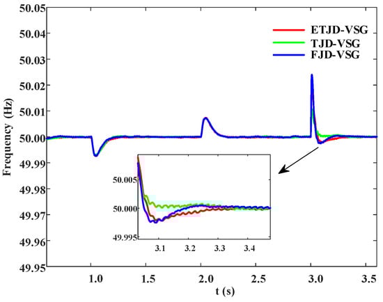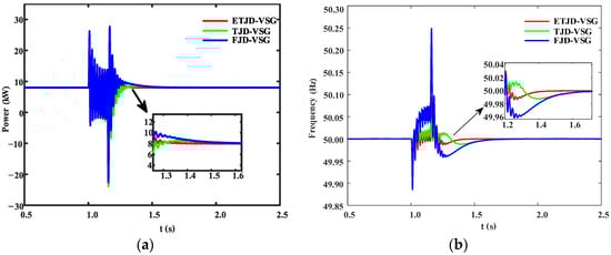 As illustrated in Figure 11b, the FJD-VSG exhibits the largest frequency fluctuation during the transient phase, with a peak-to-valley difference of approximately 0.36 Hz. The TJD-VSG and the proposed ETJD-VSG produce similarly smaller peak-to-valley variations. After fault clearance, FJD-VSG exhibits high-frequency beating between 1.15 and 1.25 s, characterized by gradually diminishing amplitude but prolonged duration. TJD-VSG shows a smaller high-frequency component; however, a “hump-shaped” secondary overshoot appears between 1.25 and 1.35 s. In contrast, ETJD-VSG converges monotonically without any additional overshoot. ETJD-VSG significantly shortens the frequency recovery time and confines the peak-to-peak frequency deviation within 0.15 Hz, confirming the effectiveness of the coordinated exponential inertia and nonlinear damping regulation.