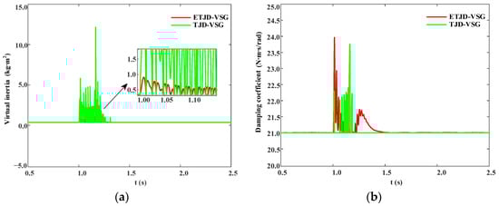 As shown in Figure 12a,b, the virtual inertia J and damping coefficient D exhibit significantly different dynamic trajectories under the two adaptive strategies following the onset of the single-phase fault. Under the TJD-VSG scheme, J rises abruptly from its base value J0 to approximately 6 kg·m2 and then undergoes repeated oscillations, while D exhibits over twenty sharp spikes, peaking at around 23.7 N·m·s·rad−1. These large values of dJ/dt and dD/dt inject high-frequency torque pulses into the electromagnetic path, directly causing the “hump-shaped” secondary overshoot observed around 1.25 s in Figure 11b. In contrast, under the ETJD-VSG scheme, the maximum virtual inertia reaches only 1.1 kg·m2, and the damping coefficient increases smoothly to approximately 24 N·m·s·rad−1 before decaying exponentially. The entire process remains continuously differentiable and free of abrupt transitions. Therefore, ETJD-VSG ensures adequate transient support while avoiding the shock effects induced by stepwise changes inherent in threshold-based methods, thereby shortening the frequency resynchronization time. These results confirm the effectiveness and engineering applicability of the coordinated exponential inertia and nonlinear damping regulation.