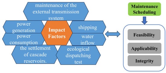 However, as shown in Figure 2, due to the large scale of power generation, the wide range of power transmission, and the interrelationship between upstream and downstream power stations, the maintenance arrangements need to fully consider the impacts or demands of water inflow, power generation, power consumption, maintenance of the external transmission system, ecological dispatching tests, shipping, and the settlement of cascade reservoirs. In recent years, the large-scale integration of new wind and solar energy and the frequent occurrence of extreme weather have led to increasingly higher demands from the power grid for the regulation capacity of hydropower and its supply guarantee capacity during critical periods. As a result, the difficulty in arranging maintenance plans for cascade power stations has been growing. Therefore, how to systematically analyze the influence of these complex factors on maintenance arrangements, quantify their weights and interaction relationships, and rationally and efficiently formulate maintenance plans has become an urgent dispatching problem to be solved for giant cascaded hydropower station groups [21,22].