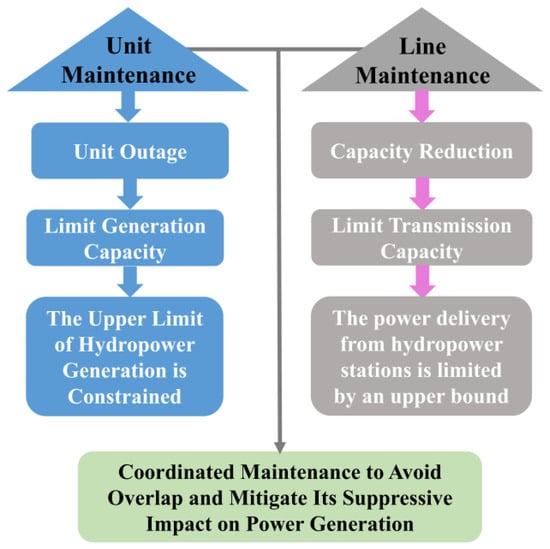 A further challenge in the CHSJS arises from the insufficient coordination between the maintenance of hydropower units and their associated transmission lines, as shown in Figure 4. While the generator maintenance directly requires unit shutdowns, reducing available generating capacity, transmission line maintenance generally does not result in total line disconnection. However, in a large-scale cascaded hydropower system with ultra-high-voltage (UHV) transmission lines, even a small derating or route constraint may significantly restrict the power delivery capability [25].