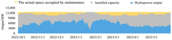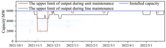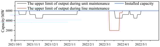 In cascaded hydropower systems, both generation units and transmission lines are subject to regular preventive maintenance. Although transmission line maintenance typically does not require a complete line shutdown, it often leads to a significant reduction in transmission capacity, which can restrict the ability of the system to deliver hydropower to receiving regions and result in clean energy curtailment, as illustrated in Figure 8. Simultaneously, generator maintenance requires unit outages, directly limiting the available generation capacity during the maintenance period.