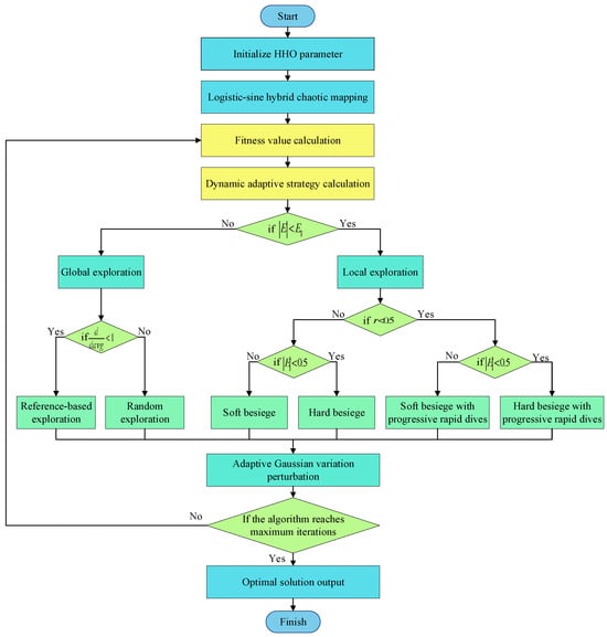 The HHO algorithm which proposed by Heidari et al. is a novel intelligent optimization algorithm inspired by the foraging and hunting behaviors of Harris hawks that is the only social birds of hawks [26]. Unlike traditional algorithms, the HHO algorithm does not rely on the analytical properties of the objective function and imposes minimal constraints on the initial point. Compared to other intelligent algorithms such as Particle Swarm Optimization and Differential Evolution, HHO offers several advantages, including fewer parameters, simpler structure, faster convergence, and enhanced local search capability [28]. The algorithm simulates the foraging and hunting strategies of Harris hawks, treating prey as the optimal solution and the Harris hawks as the candidate solution, and is divided into exploration and exploitation phases [29].
