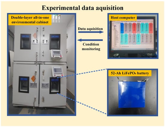 The experimental battery adopts a commercial 52-Ah LiFePO4 battery with a rated voltage of 3.2 V. And the detailed parameters are shown in Table 1. The testing setup comprises a battery testing system, an LW-150 high- and low-temperature test chamber, and a supervisory computer, as depicted in Figure 2.