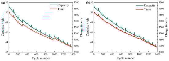 The charging time difference and capacity attenuation of batteries B1 and B2 at the same voltage rise. (a) Charge time and capacity degradation curve of battery B1. (b) Charge time and capacity degradation curve of battery B2.