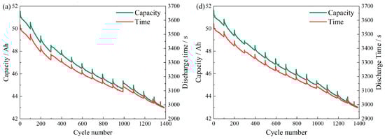 Figure 5 illustrates the fitting curve for constant-current charge (discharge) time and battery capacity. The fitted curves closely match the original capacity curves, as illustrated in Table 3. Specifically, the linear fitting between constant-current charging time and capacity achieved an R2 of 0.99 with RMSE of 0.028 and 0.0042, and the fitting for constant-current discharge voltage drop time versus capacity produced an R2 of 0.99 with RMSE of 0.026 and 0.0069. The results indicate a strong linear correlation between battery capacity and both the constant-current charging time, and the constant-current discharge drop time. These time-based features exhibit a high degree of correlation with capacity degradation and can be effectively used as health indicators to characterize battery aging and performance attenuation. In general, the proposed two health factors effectively characterize battery capacity, exhibiting low error in linear fitting with battery capacity and maintaining consistency with the battery capacity degradation curve.