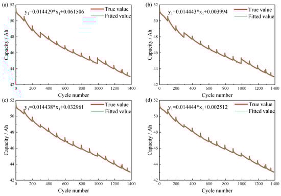 True and fitting curves of constant-current charge (discharge) time and battery capacity. (a) Constant current charging of B1. (b) Constant current charging of B2. (c) Constant current discharging of B1. (d) Constant current discharging of B2. (Note: “*” denotes multiplication.)