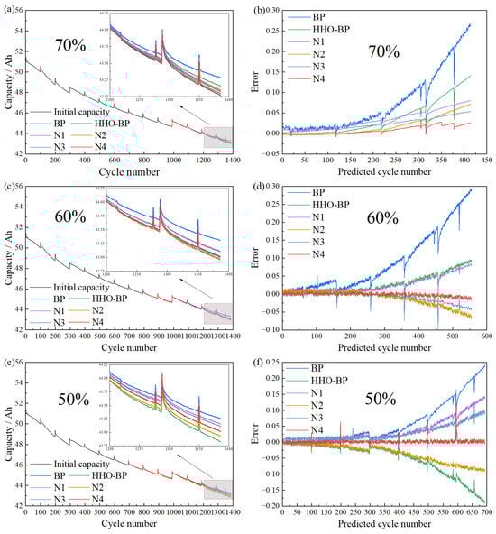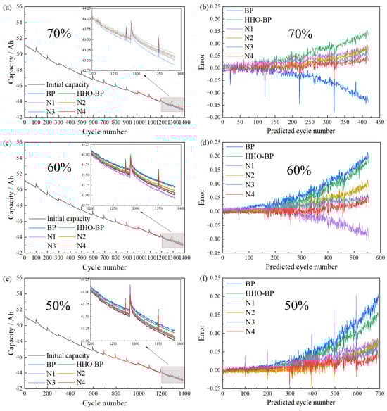 Prediction results and errors of different models for batteries B1. (a) Prediction result of 70% training set. (b) Error of 70% training set. (c) Prediction result of 60% training set. (d) Error of 60% training set. (e) Prediction result of 50% training set. (f) Error of 50% training set.