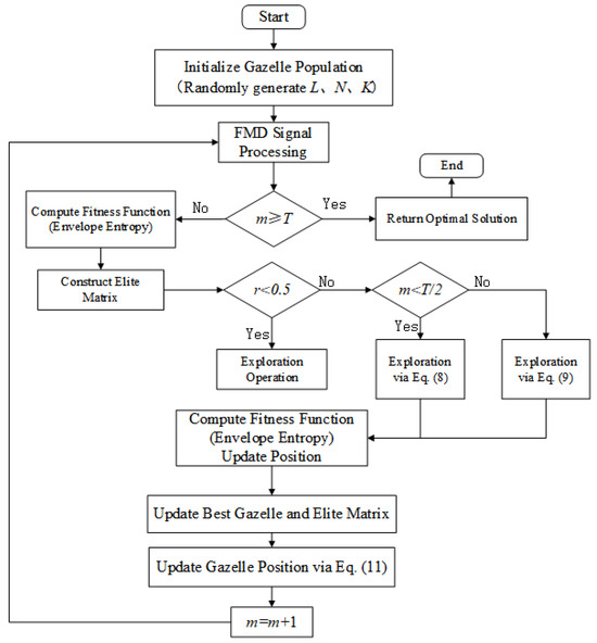 Each gazelle represents a parameter combination {L, K, N} corresponding to the filter length, the number of filters, and the mode number, respectively. FMD is applied to the original signal using these parameters, and the envelope entropy of the decomposed signal is used as the fitness function, which is defined as follows: