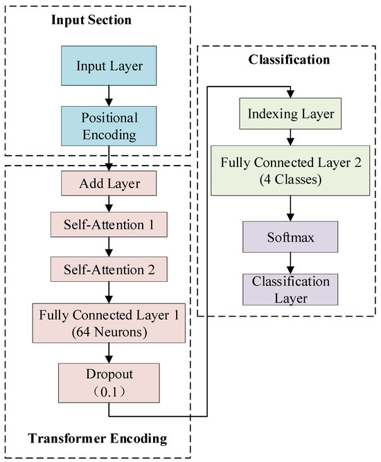 The proposed Transformer-based classification model comprises an encoder module and a classification head. The model receives a 24-dimensional input vector, derived by calculating four time domain statistical indicators from each of the six extracted IMFs. Positional encoding is initially added to preserve the sequential information. The encoded input is then processed by a multi-head self-attention mechanism, consisting of two encoder layers with four attention heads each and a model dimensionality of 128. The processed output is passed through a dense layer containing 64 neurons, followed by a Dropout operation set at a rate of 0.1 to reduce the risk of overfitting. Finally, a Softmax activation layer is employed to produce the classification probabilities. The schematic diagram of the designed model architecture is shown in Figure 3.