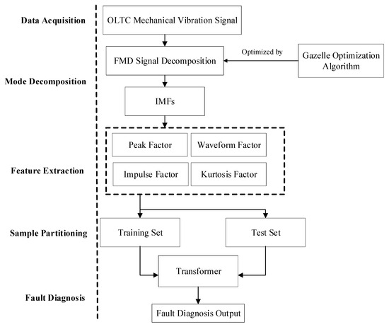 Based on the aforementioned model architecture and training configuration, the proposed OLTC mechanical fault diagnosis framework consists of five key stages: data acquisition, modal decomposition, feature extraction, sample construction, and fault classification. The overall process is illustrated in Figure 4.