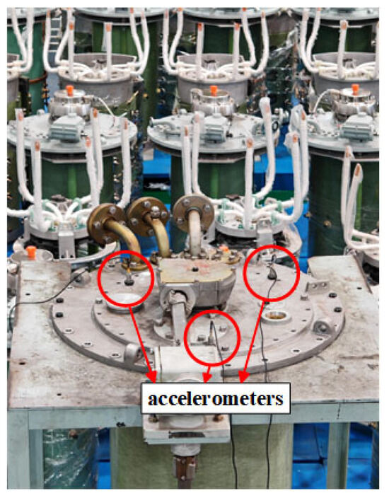 In this study, an experimental configuration for the KM-type OLTC was deployed to simulate vibration responses under both normal operating and representative mechanical fault conditions. A domestically manufactured KM-III800Y/126C-10193W OLTC prototype served as the test subject. Although the platform is based on a KM-type OLTC, the proposed method is not device-specific and is applicable to other OLTC models with similar mechanical structures. Vibration signals were acquired during the tap changing operation, providing empirical data to support the subsequent fault diagnosis research. The platform was instrumented with accelerometers (model YD38D, 100 mV/g sensitivity). The sensors were mounted in a triangular configuration on the top insulating cover of the OLTC unit, with their sensing axes oriented vertically (axial direction) as illustrated in Figure 5. This layout was chosen based on preliminary tests indicating that vibrations in the vertical (axial) direction consistently exhibited the highest amplitude in response to mechanical disturbances. In contrast, lateral directions were more susceptible to structural shaking and installation-related deviations during the tap changing operation, which could introduce measurement bias. Therefore, aligning the sensor axes vertically ensures measurement stability for vibration-based diagnostics. The triangular layout improves the spatial coverage and helps capture the localized vibration responses caused by different fault types.