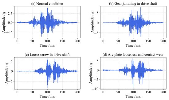 Under standard working conditions, as depicted in Figure 7a, the vibration signal displays a smooth and low-amplitude waveform, suggesting that the system operates in a steady and well-balanced state. In contrast, Figure 7b illustrates that gear jamming in the drive shaft induces sharp transient spikes and significant amplitude fluctuations, indicative of high-frequency impulse components caused by mechanical impact. In Figure 7c, the loosening of the drive shaft screw results in an overall increase in vibration amplitude; however, the observed peaks are less pronounced than those in the gear jamming scenario. Figure 7d reveals that cam plate looseness combined with contact head wear leads to waveform irregularities, the presence of sharp peaks, and substantial amplitude variations, reflecting persistent fault characteristics throughout the switching process. The comparative waveform analysis indicates that both the amplitude and duration of vibration signals are considerably greater under fault conditions than in the normal state. To further quantify these distinctions, Table 4 presents the peak value, root mean square (RMS), and dominant frequency band associated with each operating condition [41].