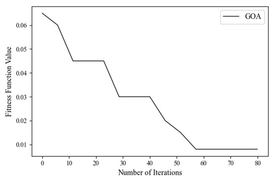 During the GOA optimization process, the fitness function utilized in the optimization process was envelope entropy, which facilitated convergence towards the global optimum. The convergence behavior depicted in Figure 8 indicates that the fitness function undergoes a gradual decline with successive iterations, eventually approaching a steady value, indicating that the algorithm gradually approaches the optimal solution. This behavior confirms both the convergence and the effectiveness of the proposed optimization strategy.