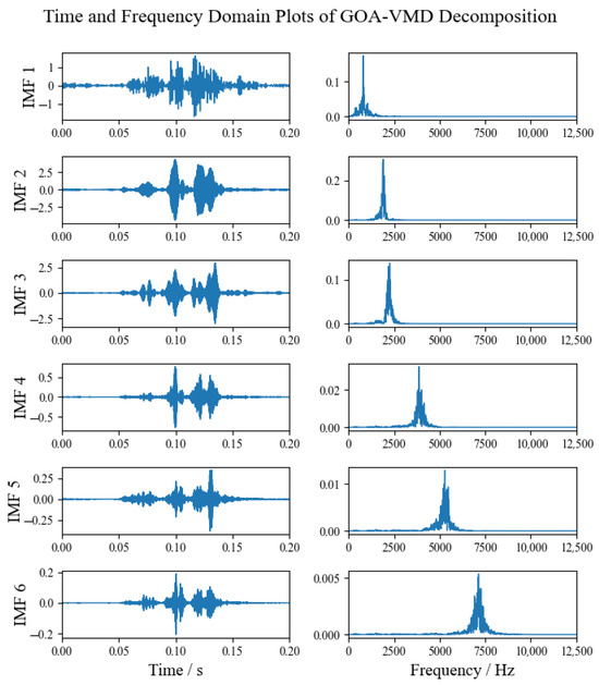 The vibration signal was decomposed using FMD, and multiple IMFs were extracted. Taking the signal under normal operating conditions as an example, its time domain and frequency domain representations can be seen in Figure 9. It is evident that the frequency bands of the individual IMFs have been effectively separated, with clearly defined boundaries and no mode aliasing. These observations confirm that the decomposition achieved a satisfactory performance under the current parameter configuration.