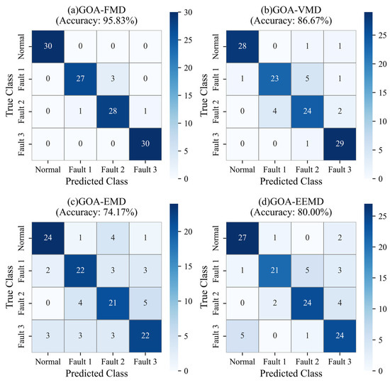 Confusion matrices comparing diagnostic results using different GOA-optimized signal decomposition methods: (a) GOA-FMD; (b) GOA-VMD; (c) GOA-EMD; and (d) GOA-EEMD. The classification results are based on the same Transformer model.