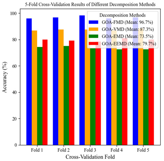 Among the tested decomposition methods, the GOA-FMD achieved the highest classification performance, with an overall accuracy of 95.83%. Notably, it reached near-perfect accuracy under both the normal operating condition and fault 3 (arc plate looseness and contact wear). In comparison, the GOA-VMD approach attained an overall accuracy of 86.67%, but exhibited noticeable performance degradation in identifying fault 1 (gear jamming). The GOA-EMD and GOA-EEMD methods yielded lower overall accuracies of 74.17% and 80.00%, respectively. These results suggest that GOA-FMD offers superior classification accuracy and robustness for OLTC vibration signal analysis, making it more suitable for practical fault identification applications. A five-fold cross-validation was performed for all methods to ensure a consistent and unbiased performance evaluation, as shown in Figure 12.