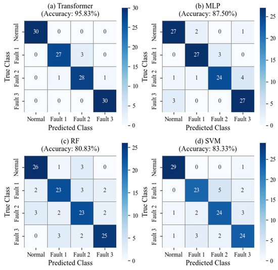 As shown in Figure 14, the Transformer model obtained the greatest average classification accuracy of 96.8% across all five cross-validation folds, significantly outperforming the other benchmark models. This result highlights its strong ability to capture both the temporal dynamics and global representations inherent in OLTC vibration signals, thereby enhancing diagnostic precision. In contrast, the MLP model achieved an average accuracy of 89.5%, while the Random Forest (RF) and Support Vector Machine (SVM) models obtained 81.1% and 86.6%, respectively. All three models fell short of the Transformer’s performance in terms of both accuracy and stability. Such findings provide confirmation of the superior representational capacity and generalization ability of the Transformer model, confirming its effectiveness as a high-precision diagnostic framework for complex OLTC fault classification tasks.