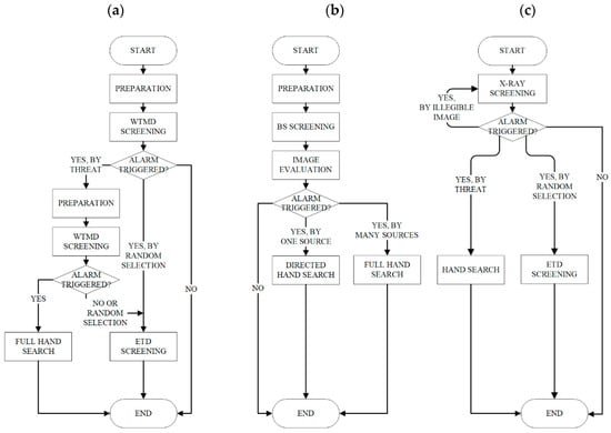 Organisation of airport security screening checkpoints: (a) Passenger screening procedure using WTMD technology; (b) Passenger screening procedure using body scanner technology; (c) Cabin baggage screening procedure.