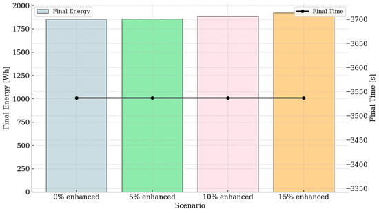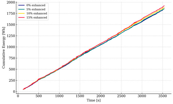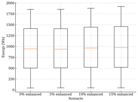 The distribution of cumulative energy values within each scenario, depicted as a boxplot in Figure 6, shows the median rising from approximately 940 Wh to about 970 Wh, alongside an increase in the interquartile range and the number of outliers under higher enhanced-screening shares, thus confirming growing variability.
