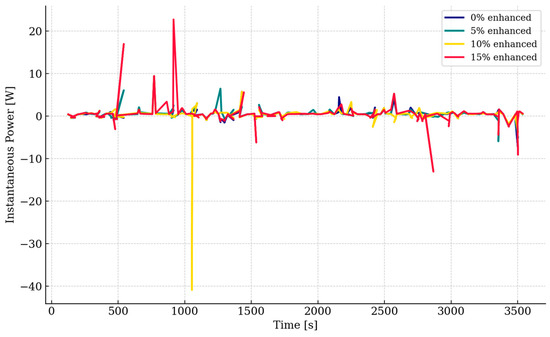 Numerical differentiation of the cumulative energy curves yields the instantaneous power profile shown in Figure 3, which reveals brief power spikes exceeding +20 W as well as occasional drops down to −40 W. Both the frequency and amplitude of these transients increase with the percentage of enhanced-screening passengers, indicating more frequent switching of X-ray and ETD devices between standby and active scan modes. Although these transients are short-lived, they may require additional power reserves and can impact the durability of electrical infrastructure.