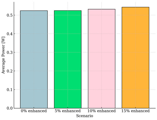 Figure 4 presents the mean power consumption ( = E_final/t_final) for each scenario, increasing from approximately 0.52 W in the 0% case to roughly 0.54 W in the 15% case. This upward trend confirms a systematic degradation of energy efficiency as procedural load increases.