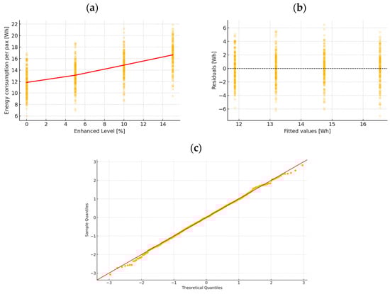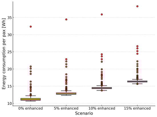 The table of descriptive statistics (Table 2) reveals a clear, gradual upward trend in average energy consumption across consecutive scenarios. In the “0% enhanced” scenario, the mean energy consumption per pax was 11.66 Wh (N = 171); in “5% enhanced”—13.37 Wh (N = 171); in “10% enhanced”—14.97 Wh (N = 164); and in “15% enhanced”—16.96 Wh (N = 154). Comparing these research results with those presented in [17,66], the energy consumption per person in this case is even 30% higher. These differences are not only statistically significant (all pairwise comparisons in Tukey’s post-hoc tests: p < 0.001) but also practically meaningful, as there is a consistent, linear increase in energy consumption with the implementation of more advanced scenarios.