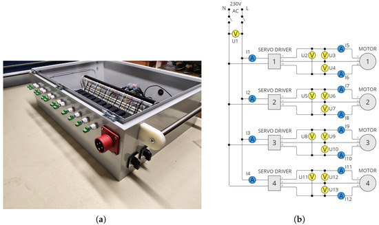 The experiments were conducted using a custom-designed research setup (Figure 2a), with its schematic illustrated in Figure 2b. The setup was configured to measure and log the current and voltage of AC/DC power supplied to four manipulators servo drives. The power supply parameters at both the input and output of the servo drivers were measured, and then used to calculate the instantaneous power for each manipulator axes. Based on the calculated instantaneous power, the total energy consumption of each manipulator drive can be estimated. The high time resolution of the measurements made it possible to calculate the energy consumption of each axis throughout the entire motion, including its distinct phases such as acceleration, constant velocity, and deceleration. Finally, the measurement system was integrated with the drive controllers housed within the control cabinet of the investigated manipulator.
