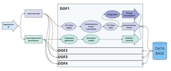 In order to process the collected data, a special package was developed in the Python environment. This package loads and filters the measured data, converts the recorded power parameters into instantaneous power and energy consumption, and visualizes selected results. The process of calculating the energy consumption of the manipulator motors is shown in Figure 3.