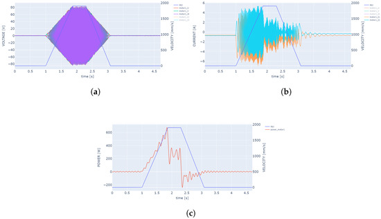 From the measurement of the current intensities of two phases, the currents of the third phase were calculated (2). The instantaneous power of the entire motor was calculated from Equation (3). A low-pass filter with a cut-off frequency of 10 Hz was applied to the instantaneous power waveform. Figure 4a,b show the phase voltage and current waveforms in the measured motor coil phases used to calculate the power. Figure 4c shows an example of the instantaneous power waveform based on actual measurement data for the DOF1 drive. The speed profile of the set motion is shown in blue on the graphs. Finally, the instantaneous power waveform is integrated over time according to Equation (4) to calculate the energy consumption of each drive.