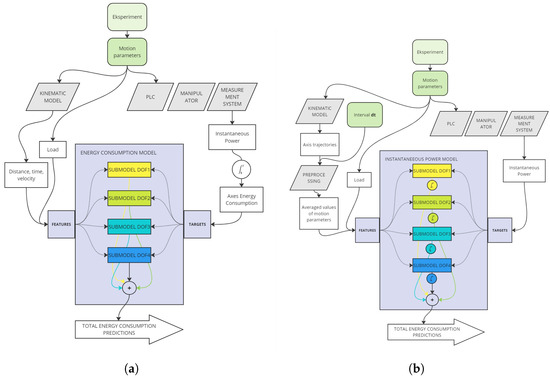 The first approach involves direct modeling of the total energy consumption of each axis during movement (Total Energy Model—TEM). The schematic representation of the TEM model is depicted in Figure 6a. The manipulator energy consumption model comprises sub-models for each axis. The input data utilized for the models encompass the total path distance of each axis, the duration of movement, the maximum achieved velocity, and the average velocity of each axis during movement. Additionally, the external load was involved. The modeled value was the energy consumption of each axis of the manipulator, calculated on the basis of power measurements collected during the experiment.