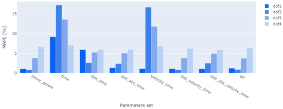 The PEM model is an indirect approach to modeling energy consumption. First, predictions are made of instantaneous power at the time of movement, and then energy consumption is calculated based on them. The input parameters for the developed models are the instantaneous values of position, speed, and acceleration, as well as the value of the load. The quality of the obtained model is greatly influenced by the time interval that describes the input parameters. Reducing the time interval enhances the temporal resolution of the instantaneous power prediction. A similar analysis to that conducted for the TEM model was performed, examining the impact of input data on the accuracy of the model. This analysis utilized the mean absolute percentage error () metric, calculated for the 10-fold cross-validation for all 1591 measurement runs. The following input data sets were compared: