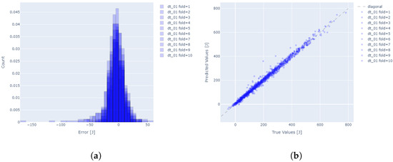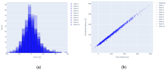 The statistics of the analyzed TEM model are presented in Table 4. The prepared model for the selected parameter set achieves average values of 1.3%, indicating high accuracy. Regardless of the data selected for training, the values of the standard deviation as well as the ranges of the minimum and maximum errors indicate a high repeatability of the models. The distribution of the residuals (Figure 8a) is very close to normal. The prediction results for the entire range of modeled values are close to the actual values (Figure 8b), indicating high efficiency of the model. The colors used in plots (a) and (b) correspond to individual folds employed in 10-fold cross-validation. In plot (a), a histogram of prediction errors is presented, where each shade of blue represents data from a different fold, enabling assessment of the error distribution across subsets of the dataset. Overlapping colors indicate how similar (or different) the error distributions are between folds. In plot (b), the color of each point denotes the fold from which the observation originates, allowing for evaluation of the model’s prediction consistency across folds. The dashed gray line represents perfect agreement between predicted and true values—the closer the points lie to this line, the more accurate the model’s predictions.