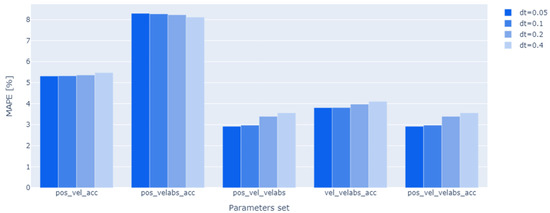Furthermore, the impact of the width of the time intervals was evaluated for each input dataset. The analysis encompassed time intervals of 0.4 s (14,765 samples), 0.2 s (25,579 samples), 0.1 s (47,155 samples), and 0.05 s (90,302 samples).The results of this comparison are illustrated in Figure 9. To improve the clarity of the findings, the mean absolute percentage error () value was calculated for all axes for each input data set and time interval.