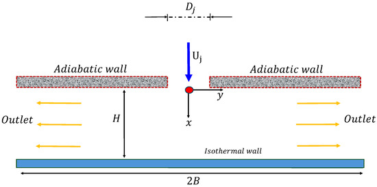 Figure 1 provides a schematic representation of the computational domain along with imposed boundary conditions. The coordinate system is such that corresponds to nozzle exit and coincides with the nozzle centerline. This way, represents the wall-normal (vertical) and wall-parallel (horizontal) velocity components, respectively. The width of the orifice is assumed as the natural reference length. In agreement with the reference experimental studies [21,22], the nozzle-to-plate distance is set to either or for the present numerical simulations. The plate extends over a breadth as high as on each side in order to reproduce the experimental set-up [21]. This choice minimizes the influence of the outlet boundary conditions on the heat transfer process mainly occurring at the impingement region, also aligning with high fidelity numerical simulations, e.g., [23]. The computational domain is bounded by an adiabatic wall located at , while corresponds to the flat plate of interest. The actual geometrical parameters are summarized in Table 2.