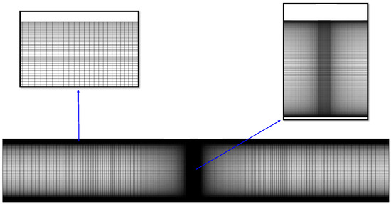 The computational domain is discretized by means of non-uniform structured meshes. As illustrated in Figure 2, the spatial resolution increases near the walls, while the FV grid gradually coarsens moving towards the lateral boundaries of the domain. Given the significant impact of near-wall turbulence modeling on heat transfer predictions, near-wall resolution is especially relevant, with dimensionless wall normal extent generally assumed as the associated measure to be controlled. In this study, the insensitive wall treatment is employed in conjunction with the generalized k- turbulence model. This treatment allows the use of meshes with arbitrary values, ranging from the viscous sublayer to the logarithmic region of the turbulent boundary layer [31]. This flexibility is especially useful in complex or industrial-scale geometries, where achieving fine near-wall resolution uniformly may be impractical. Practically, the wall-resolved (low Reynolds number) and the wall-function formulations are smoothly merged by means of a suitable blending function, which depends on the local value that is actually achieved.