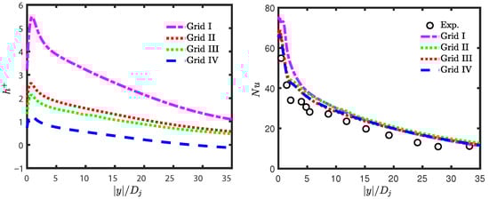 As a preliminary verification step, a grid sensitivity analysis is performed by utilizing four different meshes with increasing resolution. Table 7 shows the different cases, with and denoting the number of FV cells in the wall-normal and wall-parallel directions, respectively. The corresponding local distributions of and Nu are shown in Figure 3. Here and in the following, the dependent variable is reported as a function of the distance from the jet centerline by averaging the values on both sides of the impingement plate. Looking at the left side of this figure, grids and show sufficiently high near-wall resolution. On the other hand, examining the Nusselt number profiles, reported on the right side, the differences between the various grids are negligibly small for . Within the range , some differences are observed, with the coarsest grid noticeably overestimating the peak value. However, the discrepancies among the curves decrease with the increase in the resolution, which confirms the desired mesh convergence. Also, making a comparison with reference experimental data, grid is thus selected for all the following numerical calculations. Notably, the corresponding low value (of order one) guarantees a fully resolved near-wall treatment, with no wall-functions being actually used. Importantly, by comparing these preliminary results and the reference experiment in [22], the baseline RANS model results in being unable to predict the physical heat transfer, regardless of the numerical resolution. Although grid convergence is achieved, the present k- model notably overpredicts the Nusselt number in the impingement zone, not reproducing the experimental trends with the desired accuracy.