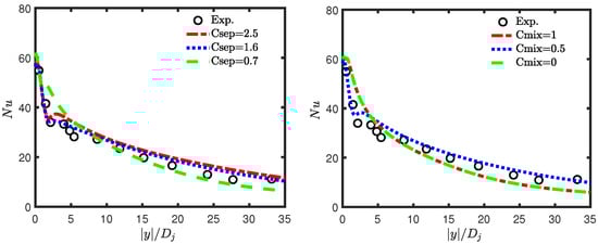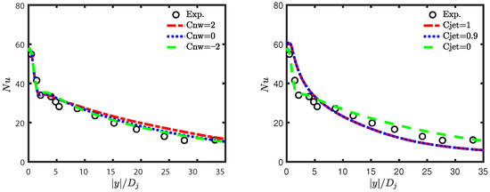 To address the influence of individual parameters of the generalized model on the prediction of the jet impingement heating process, a systematic parametric study is carried out. Specifically, each tunable coefficient is varied independently while maintaining the residual coefficients at their default values, as reported in Table 1. Practically, the effect of each model parameter on the Nusselt number distribution is examined by making a direct comparison with a reference experiment conducted at the same jet flow Reynolds number for a nozzle-to-plate distance [22]. In fact, the present analysis focuses on the following four coefficients: , , , and , which are known to influence separation sensitivity, turbulent mixing, near-wall damping, and jet spreading, respectively [32]. The local Nusselt number distributions (averaged on both sides of the impingement plate) resulting from this parametric study are presented in the following sections, compared against experimental data [22].