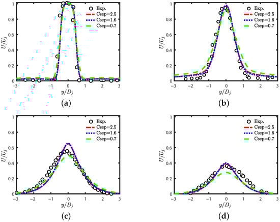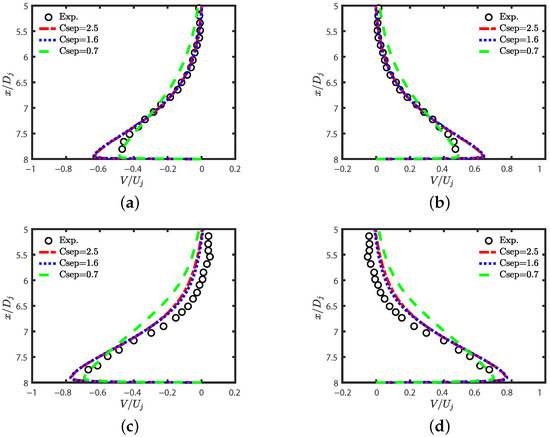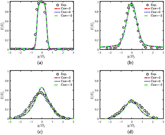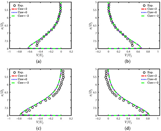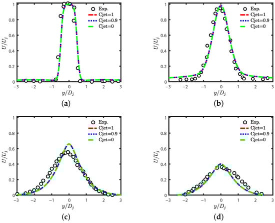 The effect of varying the coefficient is demonstrated in Figure 10 and Figure 11. For the vertical velocity profiles shown in the former figure, solutions using all tested values of closely follow the experimental data at upstream positions ( and ), indicating limited sensitivity to the coefficient near the jet exit. However, as the flow progresses downstream ( and ), the differences between the various cases become more pronounced. Similarly, the horizontal velocity profiles shown in the latter figure reveal that all configurations reproduce the general trends and remain in reasonable agreement with the experimental data at the transverse locations investigated. Closer to the jet centerline (), all values tend to overestimate the velocity magnitude in the near-wall region. Based on its overall performance, the intermediate value is selected.