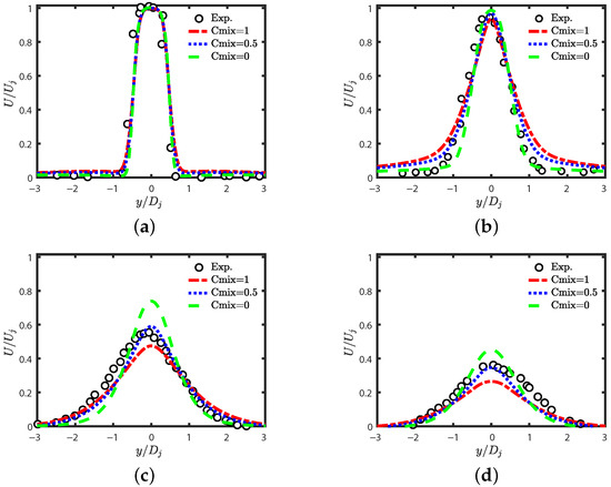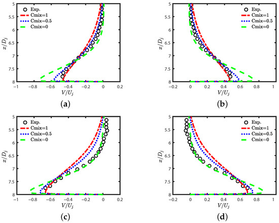 The influence of the mixing coefficient on the mean velocity distribution is illustrated in Figure 8 and Figure 9, corresponding to vertical and horizontal velocity components, respectively. The results clearly indicate that plays a crucial role in shaping both the velocity distribution within the jet core and the associated spreading rate. Actually, comparisons with the experimental data reveal that the sensitivity to varies across the domain. Specifically, at upstream axial positions ( and ), simulations with exhibit the closest agreement with the experimental vertical velocity profiles. However, in the near-wall region, this setting tends to overpredict the peak velocities, suggesting limitations in representing the momentum transport in the flow adjacent to the wall. For the horizontal velocity profiles at transverse locations , the best agreement is achieved with , whereas at , none of the tested values fully capture the experimental trend in the outer region. These observations imply that the optimal value of should be within the range , potentially offering acceptable accuracy regardless of the region. However, based on the overall performance, a value of is ultimately chosen for the present analysis, as it yielded the most consistent agreement with the experimental data in both the potential core and the developing shear layer.
