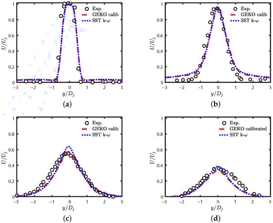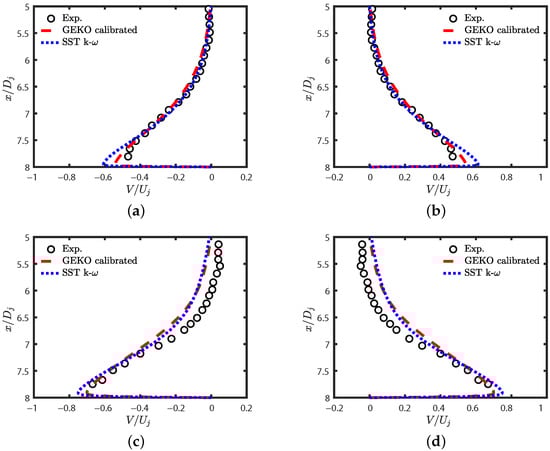 After evaluating the performance of the GEKO model in predicting heat transfer characteristics and identifying a set of optimal parameters capable of accurately reproducing the Nusselt number distribution, this section investigates the performance of the model in accurately capturing the velocity vector field. In order to compare the velocity profiles obtained by the present CFD approach with the experimental data in [21], a slightly different jet flow configuration is considered, namely at the Reynolds number and the nozzle-to-plate distance . In this case, the turbulent intensity of 9% is prescribed. Profiles for both velocity vector components are generated by systematically varying four key parameters of the GEKO model, specifically , , , and , to assess the effect of each parameter and identify the best-fit combination to accurately capture the velocity field. Specifically, measurements are presented in the following main characteristic regions of the confined jet: the potential core (), the intermediate region (), and the impingement zone (). As is common in the relevant literature, in the following discussion, the velocity components are normalized by the jet centerline mean velocity .