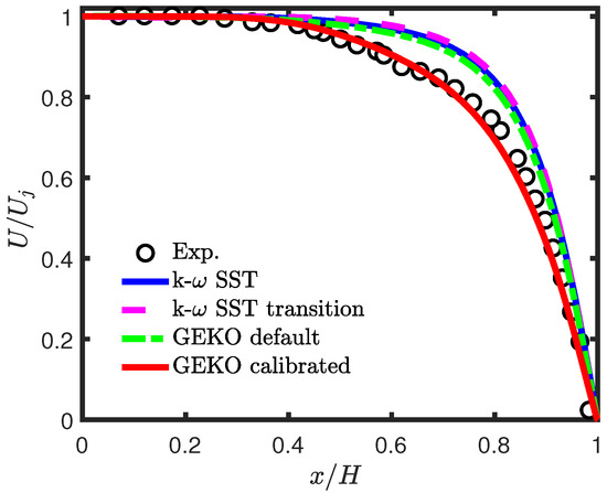 The accuracy of the present solution is confirmed by examining the vertical velocity profile along the jet centerline (), as reported in Figure 16. Different turbulence closure models are considered, including the baseline model supplied with the gamma algebraic transition model [33]. All models tested, except the calibrated GEKO, overstimate the jet spreading along the centerline, leading to an overestimation of the velocity peak along the impingement wall, when compared against experimental data [21]. This behavior is well documented in previous numerical studies, where the standard k- SST model was demonstrated to match experimental centerline velocities only within the range , e.g., [25]. Beyond this region, the different models consistently overpredict the jet core velocity and fail to capture the natural spreading of the impinging jet [34]. Therefore, the present case represents a more demanding configuration, where the jet undergoes a longer development in the free shear region. However, tuning the GEKO model allows an improvement in numerical results.