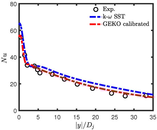The Nusselt number distribution corresponding to the optimal set of GEKO parameters is depicted in Figure 17, which demonstrates better agreement with the reference experiment [22], compared to the SST k- model. Moreover, as far as quantitative evaluation is concerned, Table 8 shows the corresponding average Nusselt number, which is calculated using in the definition (13). Again, looking at the relative error with respect to the experimental value, the improvement due to the calibrated solution is apparent.
