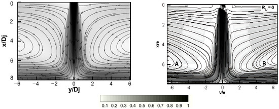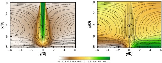 The mean flow topology provided by the optimal GEKO solution is illustrated in Figure 18, showing the dimensionless mean velocity magnitude field. The contour maps are superimposed with streamlines to enhance the visualization of the flow structure and recirculation regions. The left panel illustrates the flow field obtained from the current numerical simulation, characterized by a well-defined potential core, a symmetric intermediate zone, and two distinct recirculation zones (labeled A and B) near the impingement surface. The right panel shows the corresponding experimental PIV measurements provided in [21]. Moreover, Figure 19 shows the contour maps of the normalized vertical (left) and horizontal (right) velocity components, superimposed with streamlines to highlight directional flow features. High vertical velocity is concentrated along the jet core, while lower velocities and symmetric recirculation zones near the wall indicate strong lateral wall jets. Apparently, the numerical simulation captures the key features of the impinging jet flow, including a narrow potential core along the centerline, strong vertical momentum at the stagnation point, and the development of lateral wall jets, accompanied by marked recirculation zones.