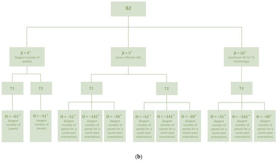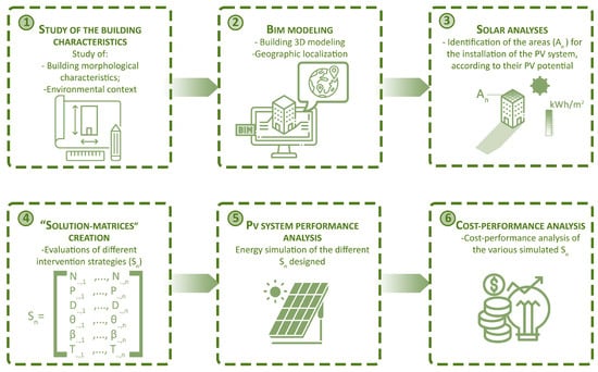 Any type of intervention on an existing building presupposes a very in-depth knowledge of its characteristics and the context in which it stands. This type of study can be conducted through inspections or consultations of project drawings (Step 1 in Figure 1). Designing a performing PV system requires careful planning that takes into account a large variety of factors, which cannot be treated accurately in manual design practice. In this context, tools such as Building Information Modeling (Step 2 in Figure 1) can bring advantages to the design process, allowing a very detailed reproduction of the morphological characteristics of the building and the context in which it is located, at any degree of complexity. Furthermore, BIM’s ability to geolocate the building, which is characteristic of specific software for PV design, constitutes one of the basic conditions necessary for conducting reliable energy studies based on real weather data. At the base of a PV system project, it is necessary to evaluate the actual predisposition of the building. In this, solar analyses performed through BIM (Step 3 in Figure 1) are very effective for highlighting the photovoltaic potential of building surfaces, taking into account their exposure and shading caused by any surrounding obstacles or particular morphological characteristics of the building. Based on these preliminary evaluations, it is possible to identify the areas (An) most favorable to the installation of photovoltaic systems. The energy production of a PV system is linked to the value of the incident solar radiation. In this context, parameters such as the orientation (θn) of the panels, their inclination with respect to the horizontal plane (βn), and the technology that characterizes them (Tn) particularly influence the exploitation of sunlight. For this reason, it would be very useful to create “solution-matrices”, which systematically represent the characteristics of the different photovoltaic system solutions conceived (Step 4 in Figure 1). BIM, taking into account the various factors mentioned above, is able to accurately simulate the different intervention strategies conceived and to directly compare their energy yield (Step 5 in Figure 1). From a cost–performance assessment of each matrix (Step 6 in Figure 1), it is finally possible to identify the most convenient solution for the case in question.