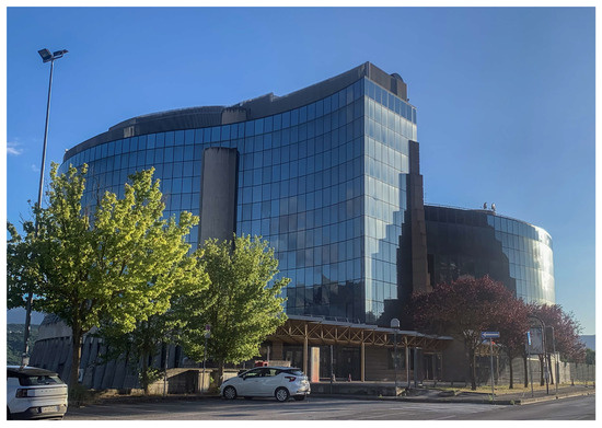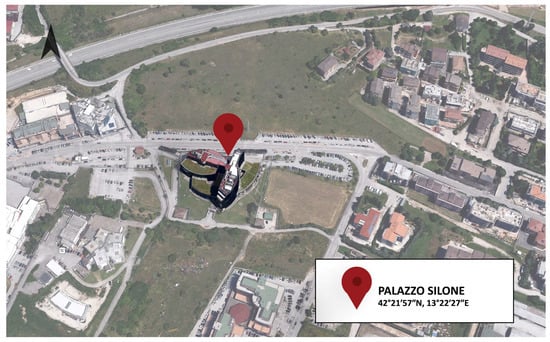 Palazzo Silone is the seat of the regional council and presidency of the Abruzzo Region in Italy. It is located on the western outskirts of L’Aquila (Figure 2) and acts as a connecting element between the historic core of the city and the new settlements, constituting with the nearby complexes of the Academy of Fine Arts (designed by Paolo Portoghesi, 1978) and the Andrea Bafile Scientific High School (designed by Zordan, 1979), a management-training center of considerable importance. Palazzo Silone has no buildings in its immediate vicinity, so it can be said that it is located in a relatively isolated context.